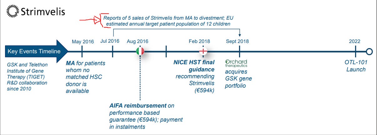 Strimvelis is one of those classic case studies on the challenges associated with gene therapy commercialization with many “lessons” to be learnt from it. Whilst the product was/is undoubtedly transformational, there are a number of issues related to its usage. One that is quite unique, is the fact that the product has a 6‑hour shelf life and is currently only available in one hospital in the world - Hospital San Raffaele Telethon Institute for Gene Therapy in Milan. This means that to get access to it, people need to travel to this hospital for treatment. Despite of this, it has received approval in a few countries; as an example for the UK, NICE approved the product stating that it can provide “NHS funding for travel and accommodation costs for people having Strimvelis and their families”.